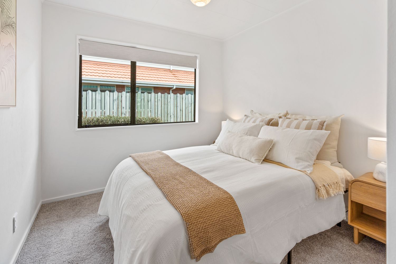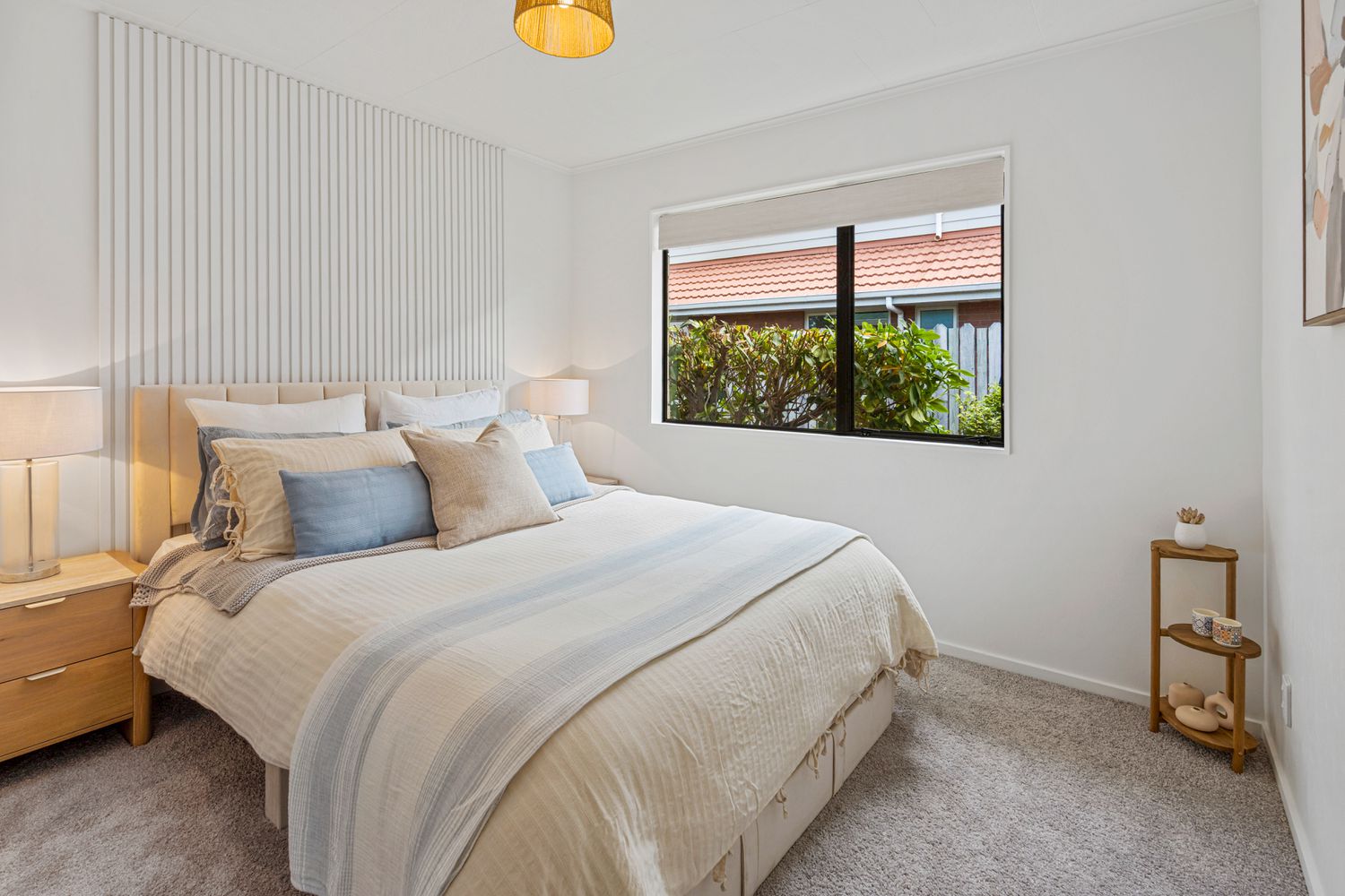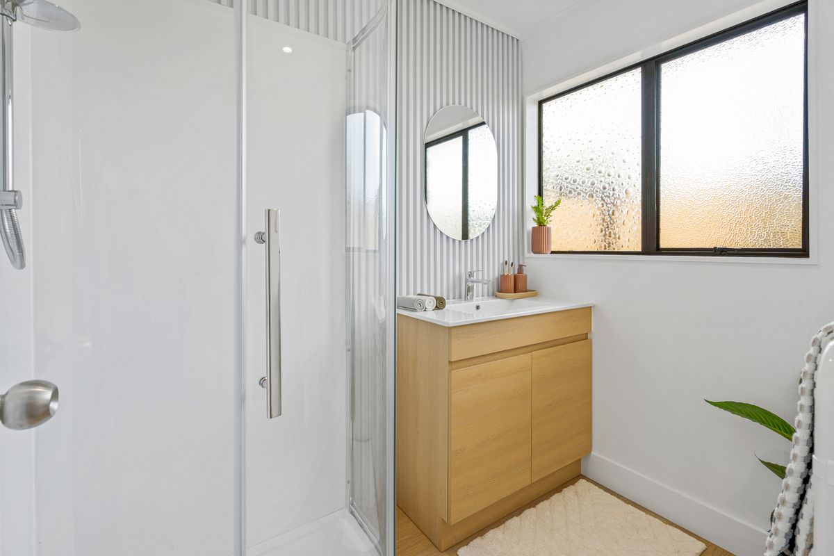 The bedroom accommodation is peaceful and comfortable, complemented by a tidy, modern bathroom that continues the home’s cohesive aesthetic.