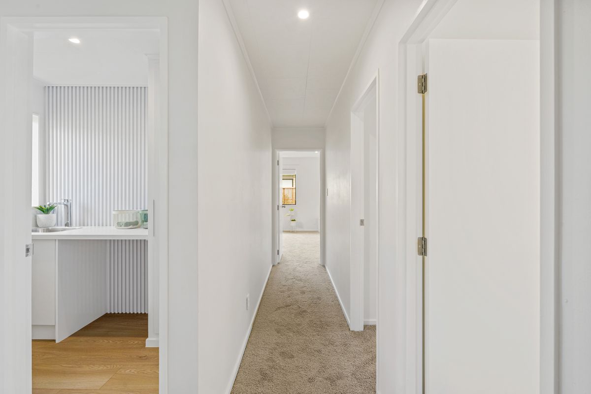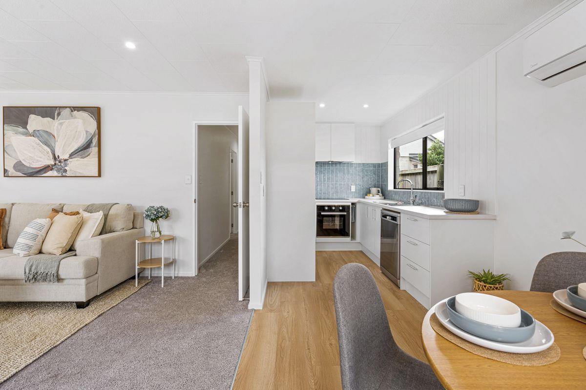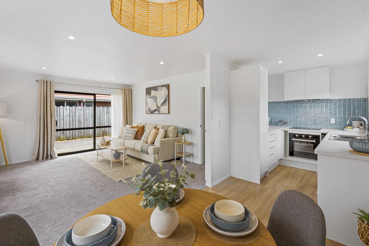 The open-plan living and dining area is well-proportioned and designed for everyday ease, flowing seamlessly through to the heart of the home. The contemporary kitchen is both functional and stylish, featuring quality appliances, excellent storage, and a fresh tiled splash back that adds character without compromising simplicity.