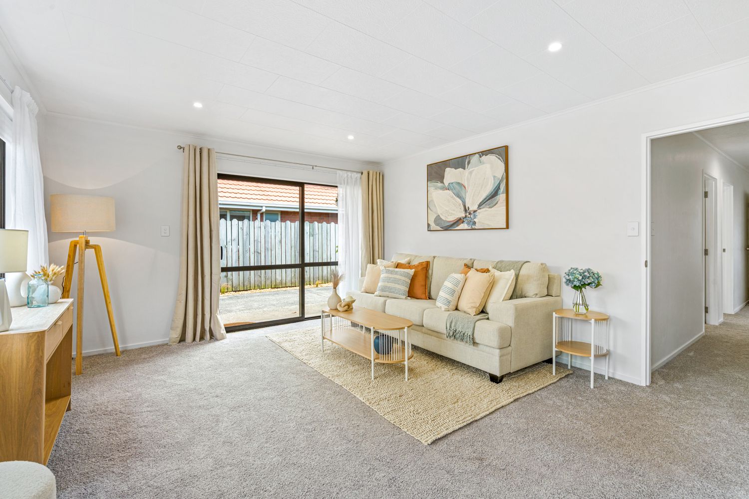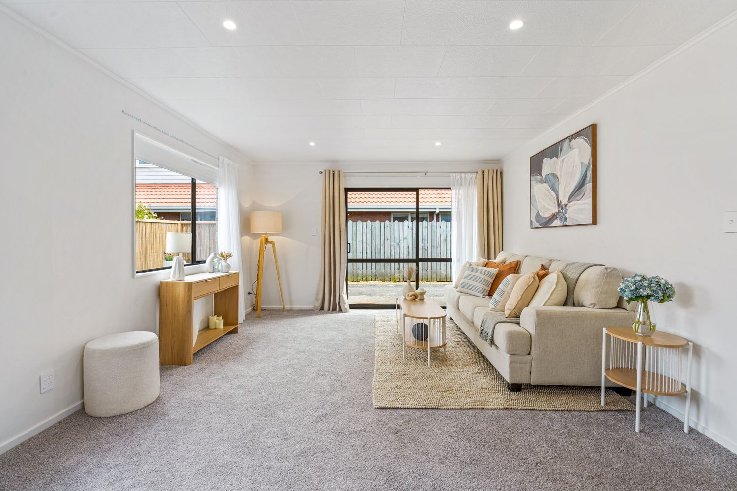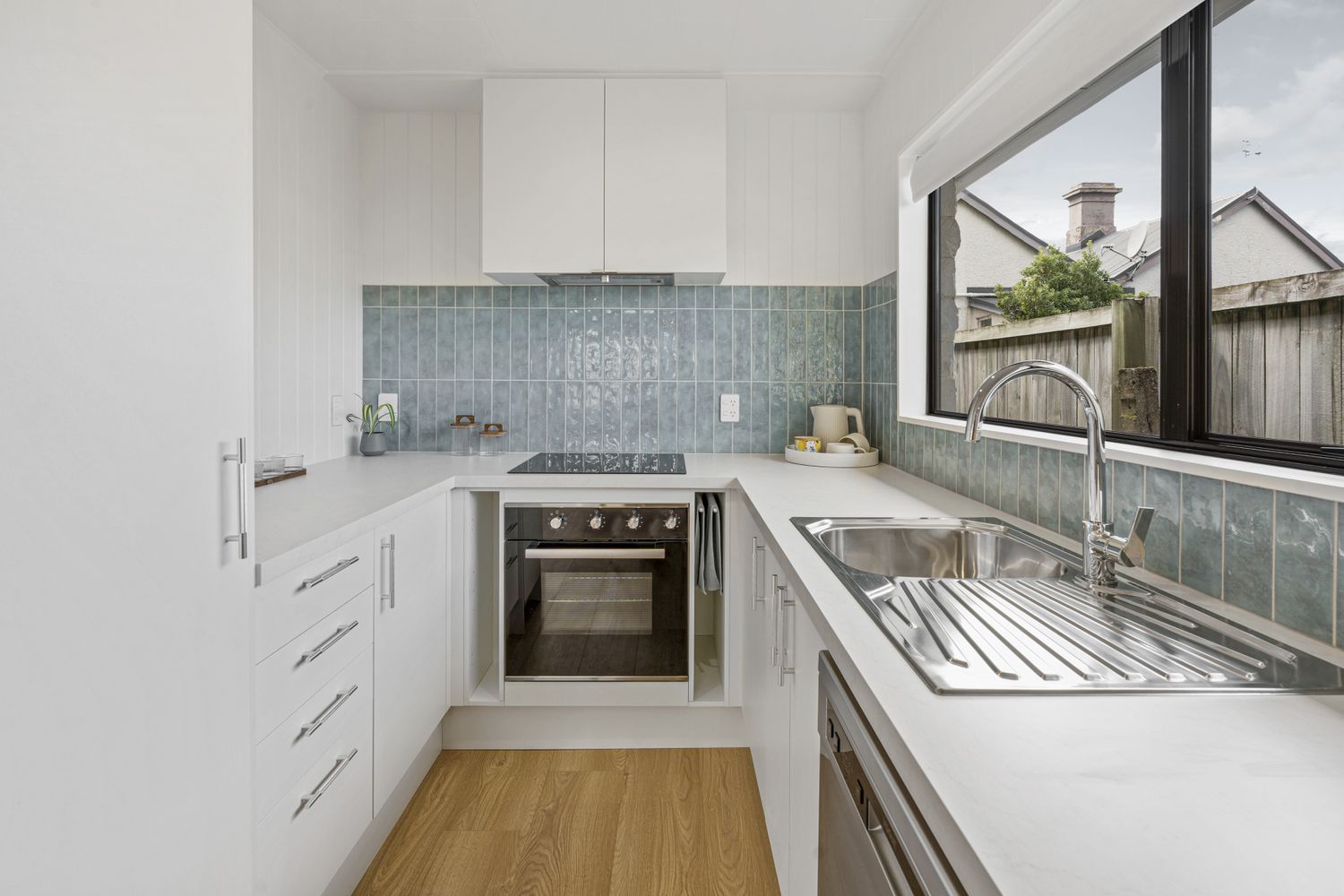 The open-plan living and dining area is well-proportioned and designed for everyday ease, flowing seamlessly through to the heart of the home. The contemporary kitchen is both functional and stylish, featuring quality appliances, excellent storage, and a fresh tiled splash back that adds character without compromising simplicity.