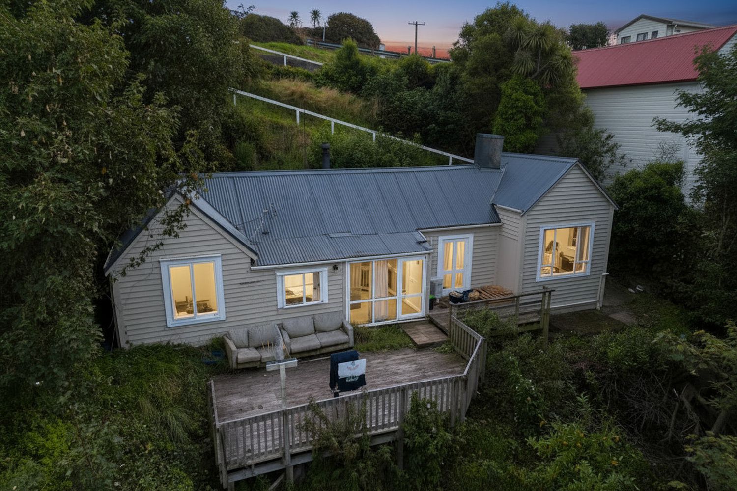 The home itself is designed for comfortable, practical living. Positioned down from the street, the elevated deck offers privacy and a welcoming entrance. Inside, a spacious living area with a log burner creates a warm central hub, complemented by three bedrooms, a functional bathroom, an easy-flow kitchen, and a mixture of single and double glazing.