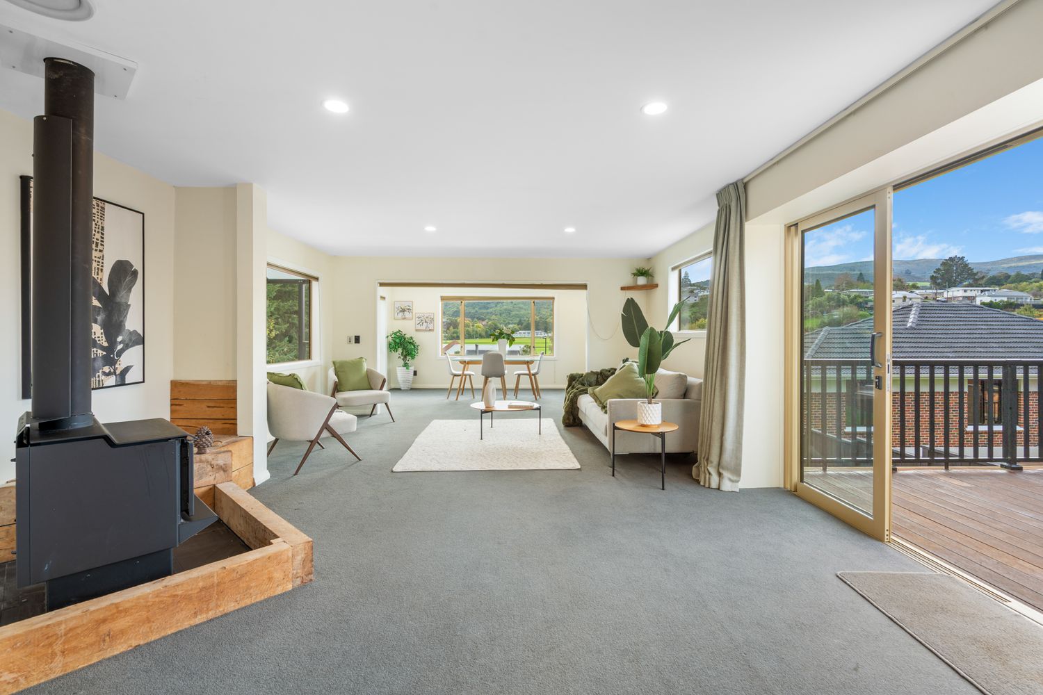 At the heart of the home, the main living level is designed for both everyday ease and entertaining. A generous open-plan kitchen, dining, and living area flows seamlessly to sun-soaked decking on both sides—allowing you to follow the sun throughout the day. A log burner adds warmth for the Dunedin winters, while an additional bedroom with external access opens to a beautiful deck with bowranda. A spacious family bathroom with underfloor heating completes this level.
